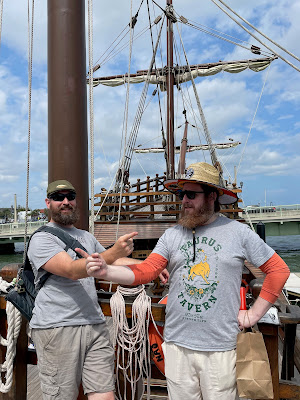I'm up early enough to be well out of everyone else's way! Ole appears first and he's headed for Publix for essentials like water and sunscreen. Gradually every one else appears and we pile into the car to park and walk to breakfast at the Kookaburra - iced coffee, iced chai (that's mine) and assorted breakfast Aussie pies! They have eggs and cheese and maybe bacon or sausage or rosemary. We take them across the street to eat in the plaza, explore there a bit and check out the Lightner Museum, across the plaza from Flagler College. We also discover the Andrew Young Crossing that commemorates the walk that he lead from Lincolnville to the plaza during the Civil Rights Movement during 1964. We are booked on the eleven o'clock free walking tour and Jenny checks us in and we get our magic stickers. That's also how we learn there are free bathrooms at the Museum!